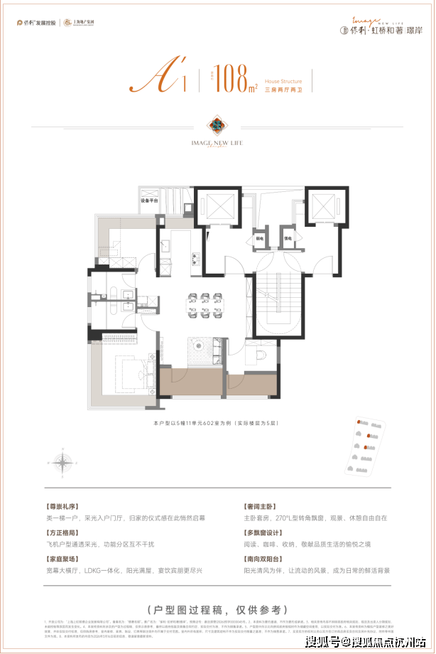 一梯一户、全明梯厅、双阳台、约270°转角飘窗,几乎找不到短板,三口之家住得宽松,三代同堂也不会局促。