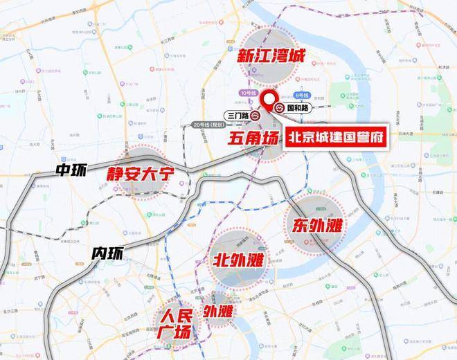 交通方面,项目周边已有10号线、8号线,未来还会增加20号线。10号线和20号线(规划中)一纵一横交汇于三门路站,形成了未来五角场2.0时代新的交通枢纽。北京城建国誉府距离三门路站直线约600米、距离20号线上海体育大学站直线约550米,步行可达。