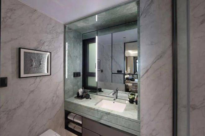 此外,客厅地面选用温德姆灰大理石瓷砖,简一大尺寸瓷砖拼缝仅0.35mm,背景板为云起姑苏岩板,玄关及餐厅墙面铺设美高梅同款金属烤漆面板,主卧入户隐形门设计,客厅一体式背景墙,橱柜收口弧形木饰面处理,餐边柜选用鱼肚灰天然石材铺设,客卫地面铺设云映星辰仿大理石瓷砖,主卫洗漱区台面配置源自意大利的只此青绿奢石。