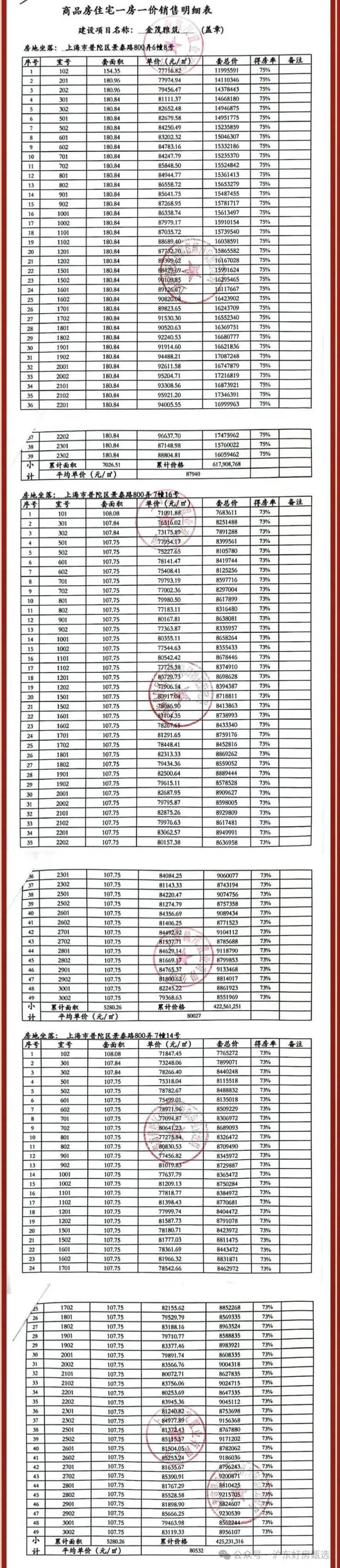 普陀金茂府一房一价表
