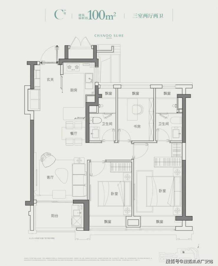 A户型为东边套,仅22套。三面宽朝南,全明双卫,设有实用的S型收纳玄关和U型厨房,主卧设有270°转角大飘窗,极致采光和景观视野。