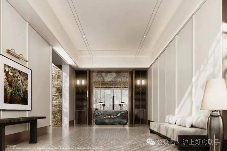 项目借鉴高奢酒店的设计,以酒店式艺术门廊作为起点,从鎏金翡绿的奢石饰面,到极具艺术感的迎宾雕塑,再到通透雅致的艺术玻璃景墙,无需刻意调整,便能从职场的繁忙状态,自然过渡到居家的松弛情绪,让归家成为一场充满质感的“沉浸式减压”。