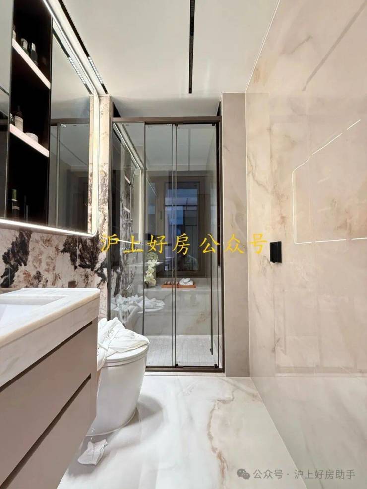 A户型连主卫都配270°转角飘窗,西侧直面杨浦内环新貌,西南侧远眺三件套,城景与生活无缝衔接。
