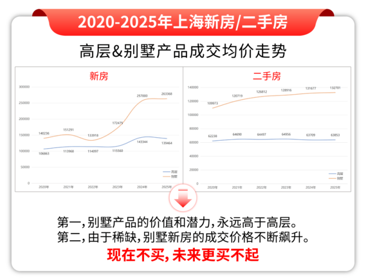 2020年至今,无论是新房市场还是二手房市场,别墅产品逆势走出了一波独立行情,成交价格和涨幅都完全碾压大平层。尤其是近两年,别墅的成交均价近乎是高层的两倍,形成鲜明对比。