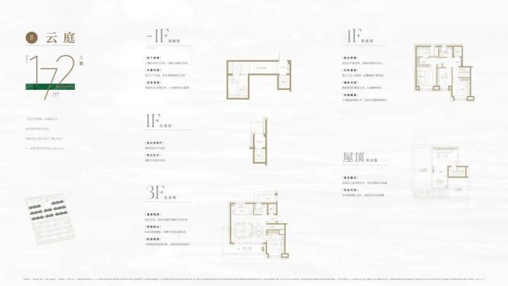 项目南北入户,附带地下室+花园+顶层露台。1F全部为活动区域,南向整体面宽约10.5米,连接南向花园;室内首层层高约3.4米,采光、视野都很优越。