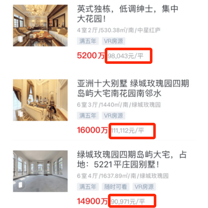 即使是在市场冷静期,绿城玫瑰园和九星红庐的挂牌价依旧坚挺,最近的挂牌价格约在9-11万/㎡左右,总价在5000万-1个亿。