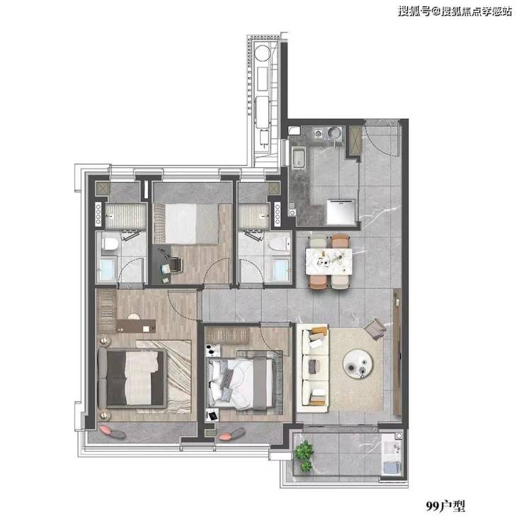 三开间朝南的设计,全卧室带飘窗、客厅带阳台,采光、通风、视野、尺度感这个户型都具备。更重要的是,3房的设计保证了从二人世界到三代同堂的全生命周期需求。再加上约600万起的总价,这个户型不用多说,年末上车的绝对首选。