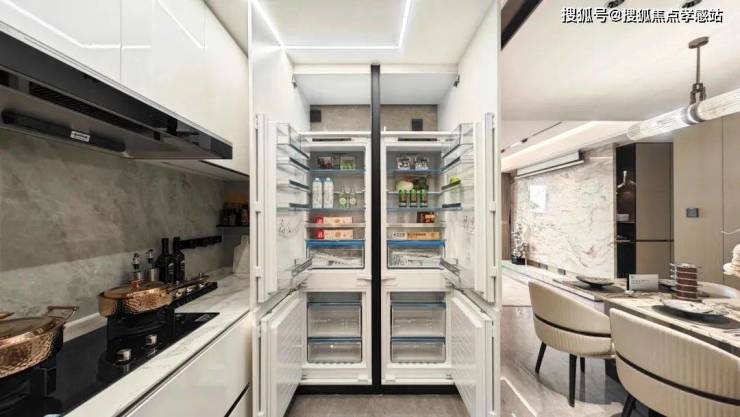 甚至连大部分项目不配备的冰箱也是交付标准,还特别配置了轨道插座、前端净水器和凉霸、吊轨金属玻璃移门,既美观又方便清理。