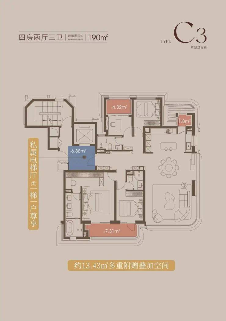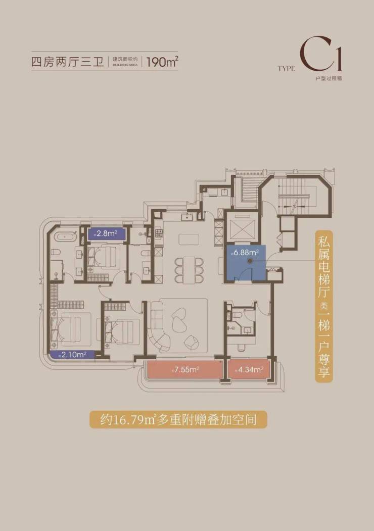 建面约190㎡的4房3卫户型,南向双套房的设计,保障了居住的私密性。