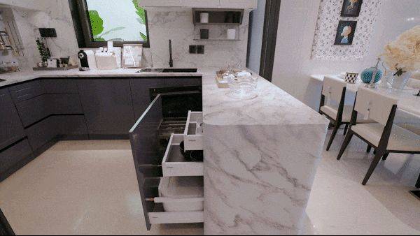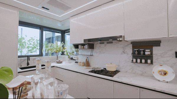 此外,通过手机APP可远程控制烤箱预热、冰箱调温及烟机动态风量调节,实现智能便捷操作。收纳系统依托博洛尼整体橱柜,利用转角空间、钻石台面及下拉式拉篮等设计,配合可按压开柜、反光镜等巧思,大幅提升空间利用率与取物便利性。厨房装修采用E0级环保板材与抗菌岩板,从源头杜绝污染,确保耐用易清洁。