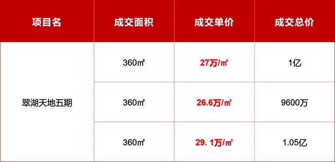 黄浦新天地翠湖五期360㎡大户型过去半年的成交价格,均在26.6万/㎡+,价格最高的一套单价甚至达到29.1万/㎡。