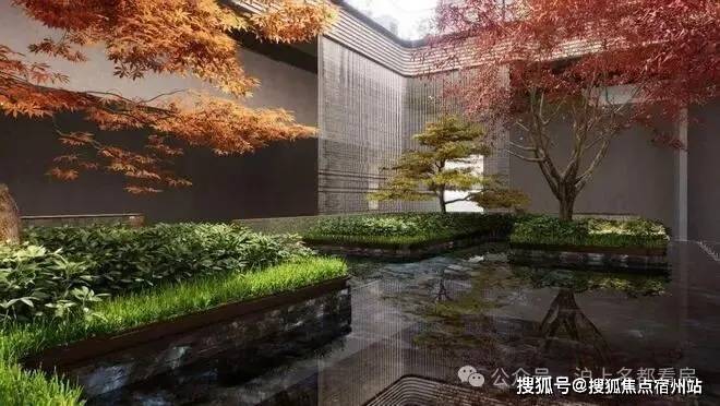 下沉式庭院宽约18米、进深约9.5米,通过水帘连通上下景观,水晶砖景墙与层层叠水形成视觉焦点,夜晚灯光下宛如艺术馆。