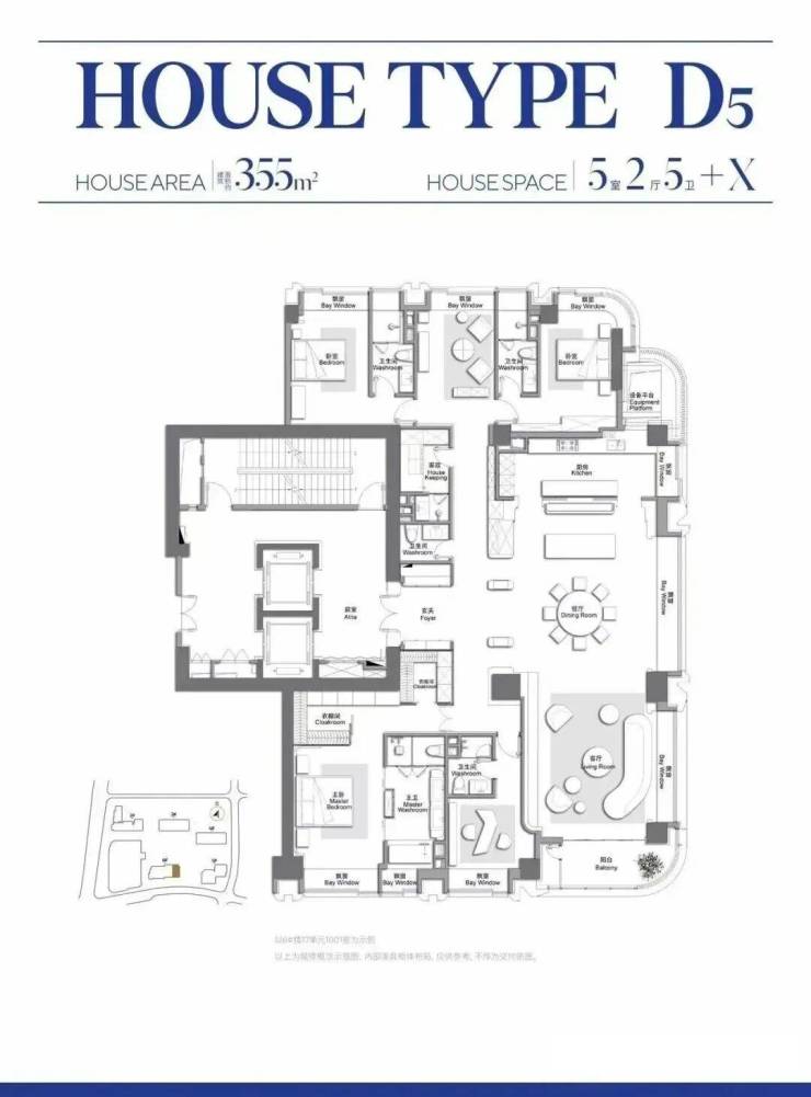 楼王户型建面约355㎡采用“洄游动线+弹性空间”设计,五房格局中四间为套房,满足多代同堂需求。
