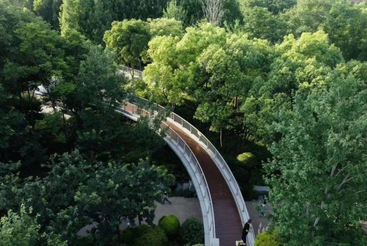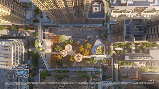 下面则是约4500万方的中央景观,点缀森感公园、九曲花街、花园大道等景观组团。从高线公园俯瞰,三个“树屋中心商业”穿插其中,整个景观很立体,层次感很强。
