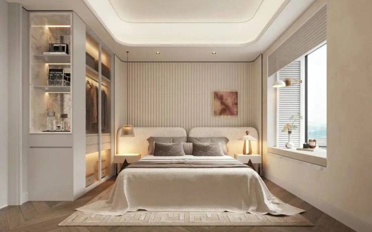 建面约180㎡三房打破市场常规的四房配置,打造差异化大三房,客厅及主卧面宽均超4米,配备约270°弧形观景阳台,双主卧尺度,北向大次卧和南向主卧几乎等面宽,实现家庭成员尺度的平权。