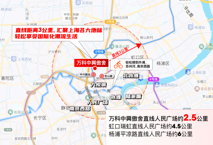 从地理坐标来看,万科·中興傲舍身处静安内环中兴城板块,以自身为中心直线距离约3公里范围内,南京西路、人民广场、外滩、外白渡桥、陆家嘴等城市地标星罗棋布。