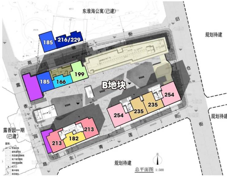 其中右上角的A地块是高层住宅,大概150套住宅,北栋为建面约263-370-487㎡;南栋为建面约279-290-375-494㎡。