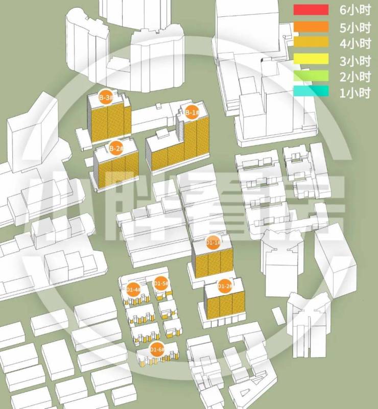冬季:B-2#、D1-2#、D1-4#、D1-5#、D1-6#采光优异几乎不存在遮挡。B-1#、B-3#、D1-1#受遮挡。就具体遮挡时间而言,B-1#主要在上午受东部住宅楼遮挡。B-3#主要在早晨受B-1#遮挡,上午和中午受B-2#遮挡。D1-1#主要在上午受东部住宅楼和D1-2#遮挡。