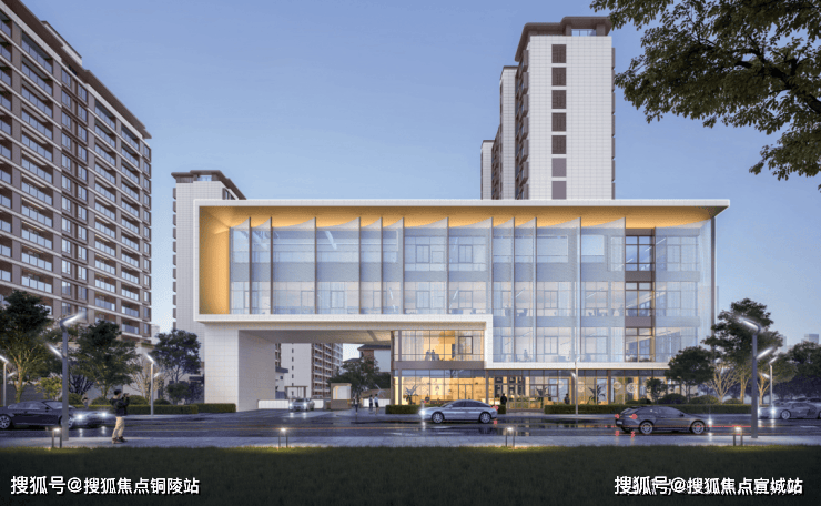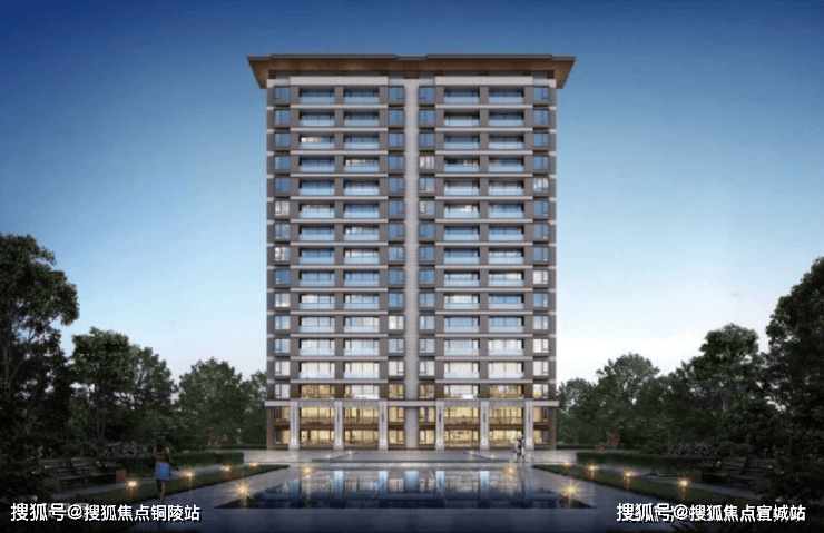 晶幕高层楼栋,采用公建化立面,极简现代风格,阔景阳台、大面积玻璃,端庄大气。