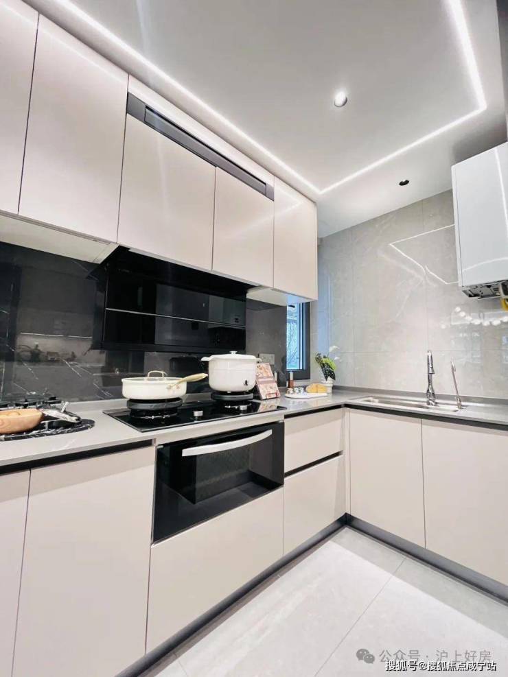 在细节上同样不遗余力。比如入户后的玄关柜是交付标准,打开厨房柜体、镜柜等各类收纳空间时均有惊喜;再如客厅和主卧均采用弧形吊顶,还有风暖浴霸、玄关顶面感应灯等细节,都透露出项目对品质生活的追求。