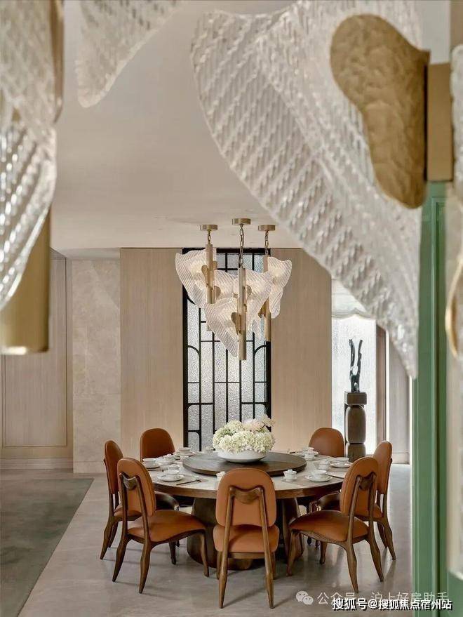 士林润园售楼处电话400-8787-740☑️☑️餐厅的设计巧妙融合了老上海的经典元素,圆形餐桌和橘色皮质餐椅在色彩上既现代又充满活力,顶部的水晶吊灯造型灵感来自上海市花“玉兰花”,既增添了空间的华丽感,又巧妙地融入了上海的地域特色。士林润园售楼处电话400-8787-740☑️☑️