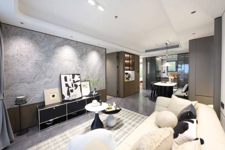 除了精装外,项目还有更多的品质感表现。例如客厅地 面选用的是北京城建国誉府高定的 温德姆灰大理石瓷砖 ;简一大尺寸瓷砖,拼缝仅0.35mm,工艺复杂,几乎无缝,整体性强