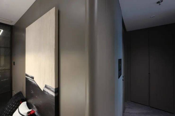主卧入户隐形门设计/客厅一体式背景墙/橱柜收口 弧形木饰面 处理;