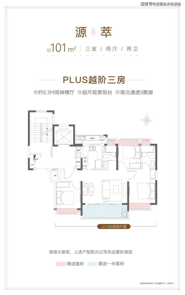 建面约101㎡3房2卫户型,非常标准的飞机户型。