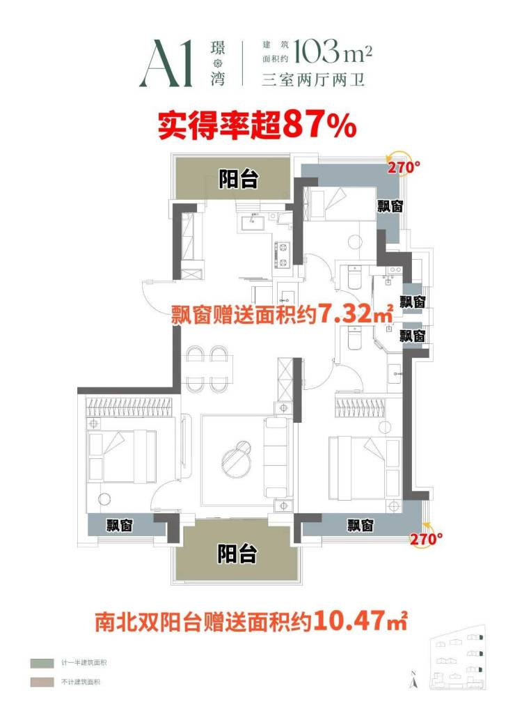 建面约103㎡A1户型,约10.47㎡南北双阳台空间,阳台“买1赠1”,赠送约5㎡,南侧观景阳台,北侧功能阳台,更附赠约7.32㎡飘窗,实得率超87%。