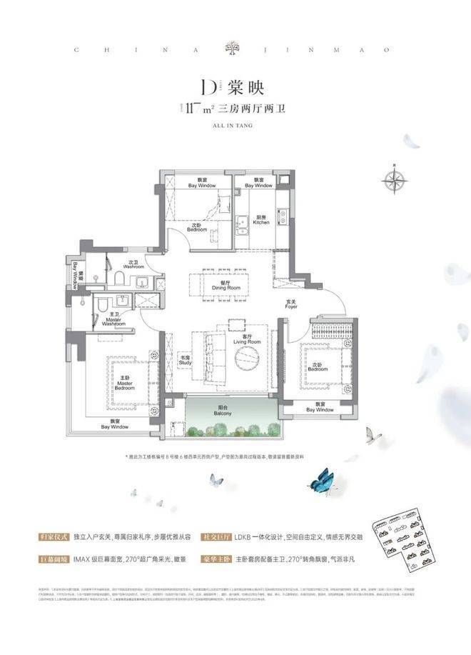 建面约117㎡3房2厅2卫,做到了3+1开间朝南+5个飘窗+主卧套房设计+270°转角飘窗,所有的尺度都有进一步提升。