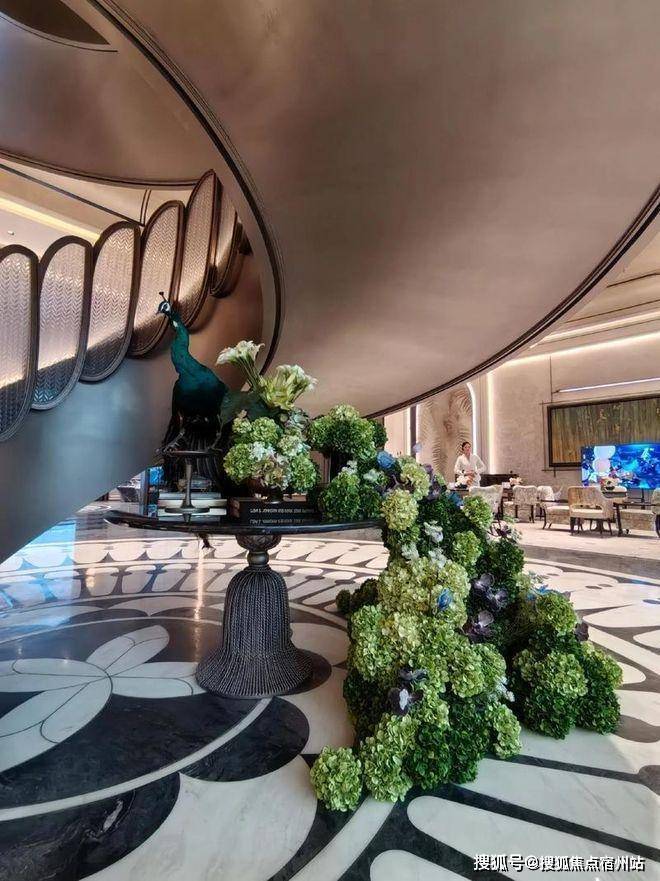 循着艺术楼梯向下,氛围悄然流转,便步入了“绿意花园”的静谧之境。楼梯扶手的曲线模拟藤蔓缠绕的意象,点缀着象征新芽的精致构件,与一旁栩栩如生的孔雀装置相映成趣,尽显人与自然的和谐共生。负一层的浅洽谈区是下沉庭院的核心,设计师深谙东方“师法自然”之道,将盎然绿意引入室内,一丛丛繁花营造出湿润林下的微气候,与抽象化的雨林艺术画作呼应,共同颂扬生命的丰饶与形式之美。低矮亲和的温润家具、以晶莹叶片为装饰的空间细节,让每一位来访者都能卸下城市的喧嚣,沉浸在绿意与摩登交织的静谧之中,体味“天人合一”的悠然意境。