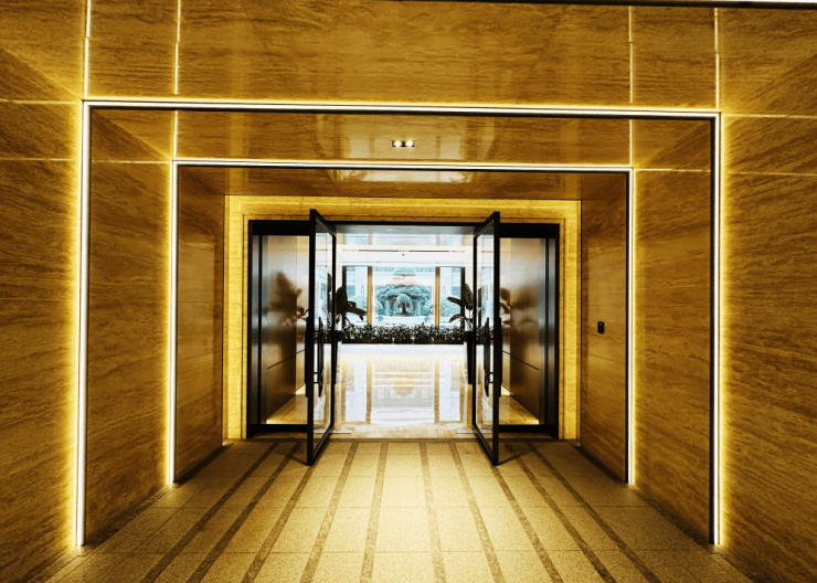 门口的迎客松,棋盘格式的地板铺排,天光漏隙式的门口穹顶,彰显了归家仪式的门面。