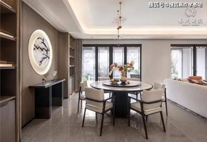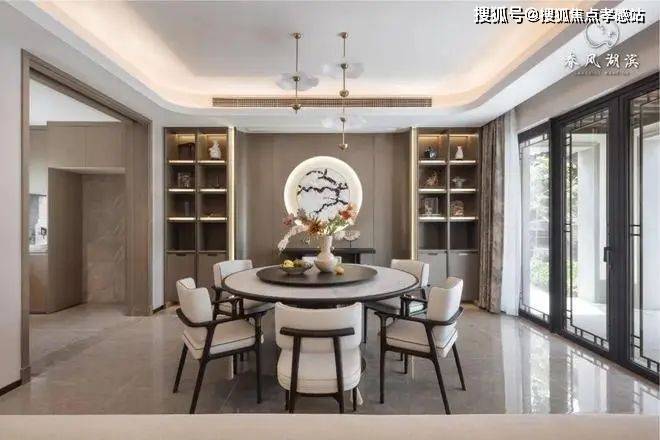 极简的线条强调出空间的自然与纯粹,巨幅落地玻璃将室内外的景致互相交融,作为业主专享的休憩与社交空间,可一边欣赏中央水院美景,一边与至交好友对坐倾谈,别有一番韵味。