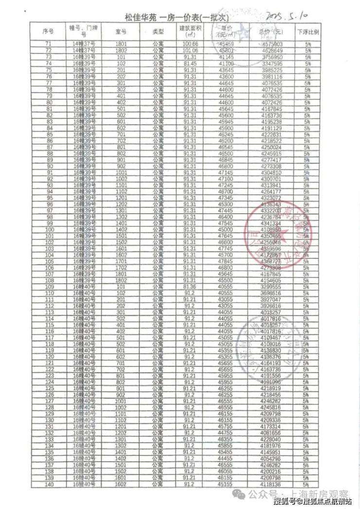 上期一房一价表如下