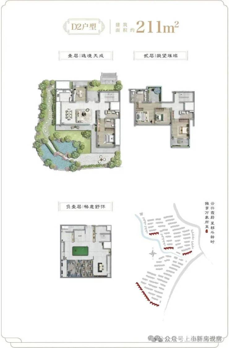 从户型设计上看:建面约138-188㎡联排与建面约211-214㎡院墅产品,庭前绿地,大面宽,地上仅2层,真正的低密宽境别墅,产品力断层式领先。