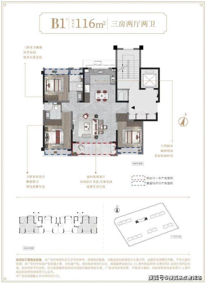 116m²户型特点:三卧室全飘窗,科学布局,悦享自然美好,南向宽境客厅,灵动设计书房/儿童乐园,延伸生活尺度,U型厨房,阔绰明亮,美好私厨时光,主卧套房设计,飘窗独卫,境见优雅生活。
