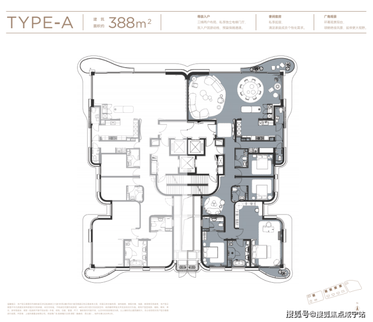 首先,三梯两户布局,私享独立电梯门厅;双入户洄游动线,预留保姆通道,顶豪该有的尊崇感被诠释得淋漓尽致。