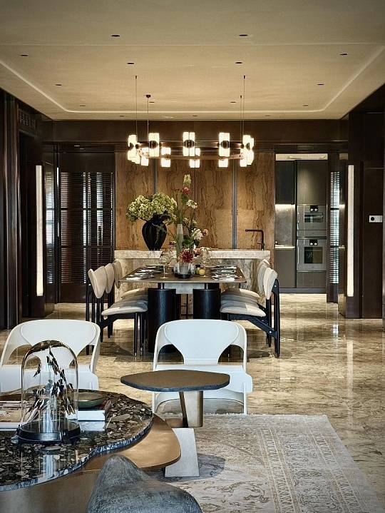 万科中興傲舍的设计团队汇聚了17位国际新锐设计大师,他们融合了不同国家与文化的设计理念,为项目注入了独特的艺术灵魂。项目汲取邬达克建筑风格精髓,呈现经典三段式结构,竖向线条清晰挺拔,层层递进的Art Deco元素,回应着海派建筑文化的特质。外立面采用珍珠蓝铝板搭配香槟金、摩登红等色彩,营造出既现代又不失典雅的视觉效果。约270°的圆弧造型与弧线阳台设计,不仅增加了建筑的灵动性,更让业主在家中即可尽享城市美景。