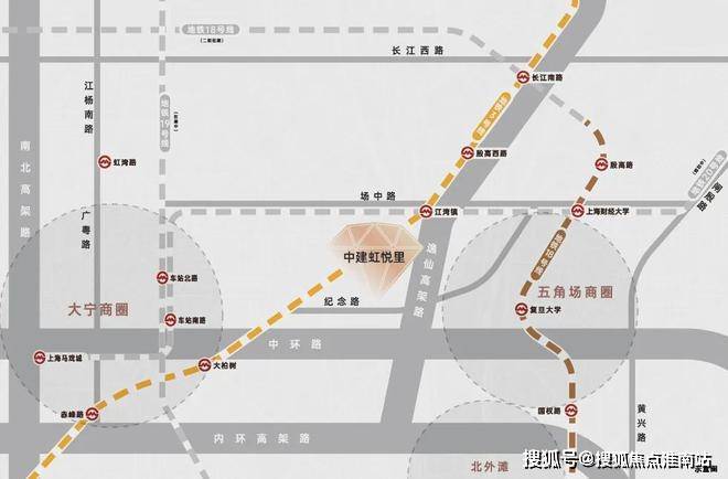 项目是真正中环旁新盘,直线距离中环仅约600米;同时这一段中环和内环紧挨着,因此中建·虹悦里直线内环也仅约1.2公里;此外,东侧还邻近逸仙高架路
