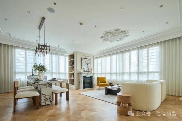 入门的玄关景墙与地面的石材拼花形成呼应,装饰的手绘艺术画呈现宁静优雅的氛围。主人在离家前可在此等候司机,或在归家时在此更衣。配上本白的护壁板和圆弧的门框,以及高大落地窗,房间里充满了一种“空气感”。