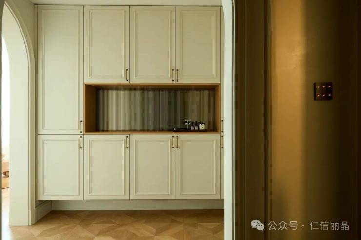 电梯厅以法式宫廷风流线型化设计,潮流艺术、流畅大气,空间更显通透,明亮、优雅、高贵的氛围扑面而来。两边拱形门洞和立柱,不仅增加了尊贵的仪式感,也提升了空间转换的联动性。