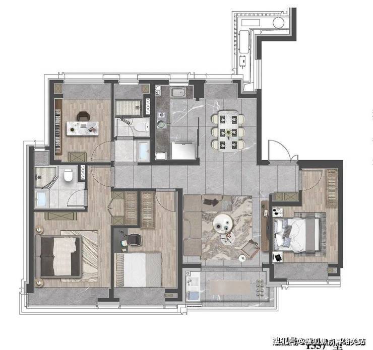 该户型贴合当代人居生活习惯,既适合三口之家小太阳家庭,也可以是三代同堂,每个人都能拥有独立空间。