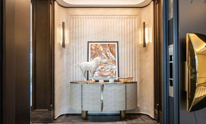 例如入户玄关铺设有“石材皇后”鱼肚印象,这种级别的奢石在很多顶豪项目中通常仅作局部镶嵌