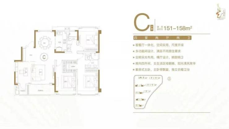 建面约151-158㎡四室两厅两卫户型特点:客餐厅一体化,空间实用,尺度开阔;多功能间设计,满足不同居住需求;全明采光布局,横厅设计,明厨明卫;南向四开间,主生活区域朝南,阳光清风常伴;套房式主卧,主卧带飘窗,独立衣帽卫。