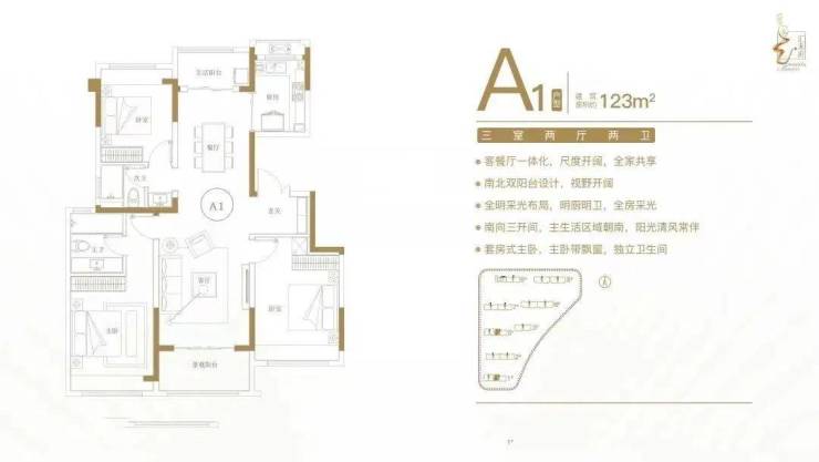 建面约123㎡三室两厅两卫户型特点:客餐厅一体化,尺度开阔,全家共享;南北双阳台设计,视野开阔;全明采光布局,明厨明卫,全房采光;南向三开间,主生活区域朝南,阳光清风常伴;套房式主卧,主卧带飘窗,独立卫生间。