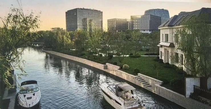 项目从此前曝光的设计方案就可以看出亮点,每一排别墅前都有一条渠道,引入水系,可以停游艇。