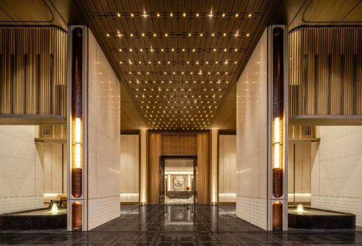 鎏金塔冠,采用曲面拉伸铝网,包裹古铜色铝板,用金属的筋骨雕刻出无数个优雅的弧面,勾勒出静安的天空。