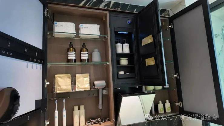 主卧套房,主卫镜柜内置牙刷消毒器、吹风机架,美妆冰箱,这些现在基本都是标配了,不过项目在美妆冰箱下方还做了个口红收纳格。