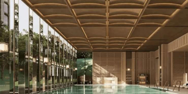 “回归之境”以3500㎡下沉水苑为核心,汇聚会客、泳池、茶室等多功能空间,形成仪式感十足的社区舞台。