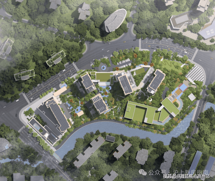 步入社区的第一重仪式感,始于社区整体抬升约1.3-1.4米的“玉盘托珠” 格局。设计师以精妙的地形重塑,将河道景观化为私家长廊,形成天然的视觉屏障与观景台。